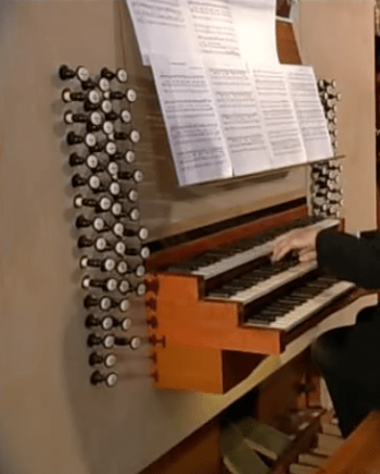 II. ManualOberwerk Gambe 16 Principal 8 Salicional 8 Hohlflöte 8 Unda maris 8 Gedackt 8 Prestant 4 Flaute douce 4 Nasard 2 2/3 Oktave 2 Flöte 2 Terz 1 3/5 Flageolet 1 Mixtur 5f Trompete 8 Krummhorn 8 Tremulant schwach Cornett 5f Carillon 3f |
