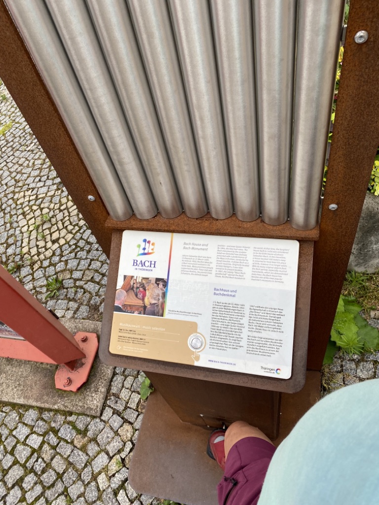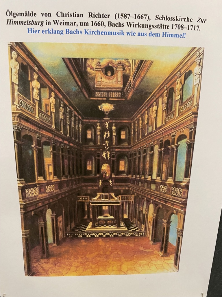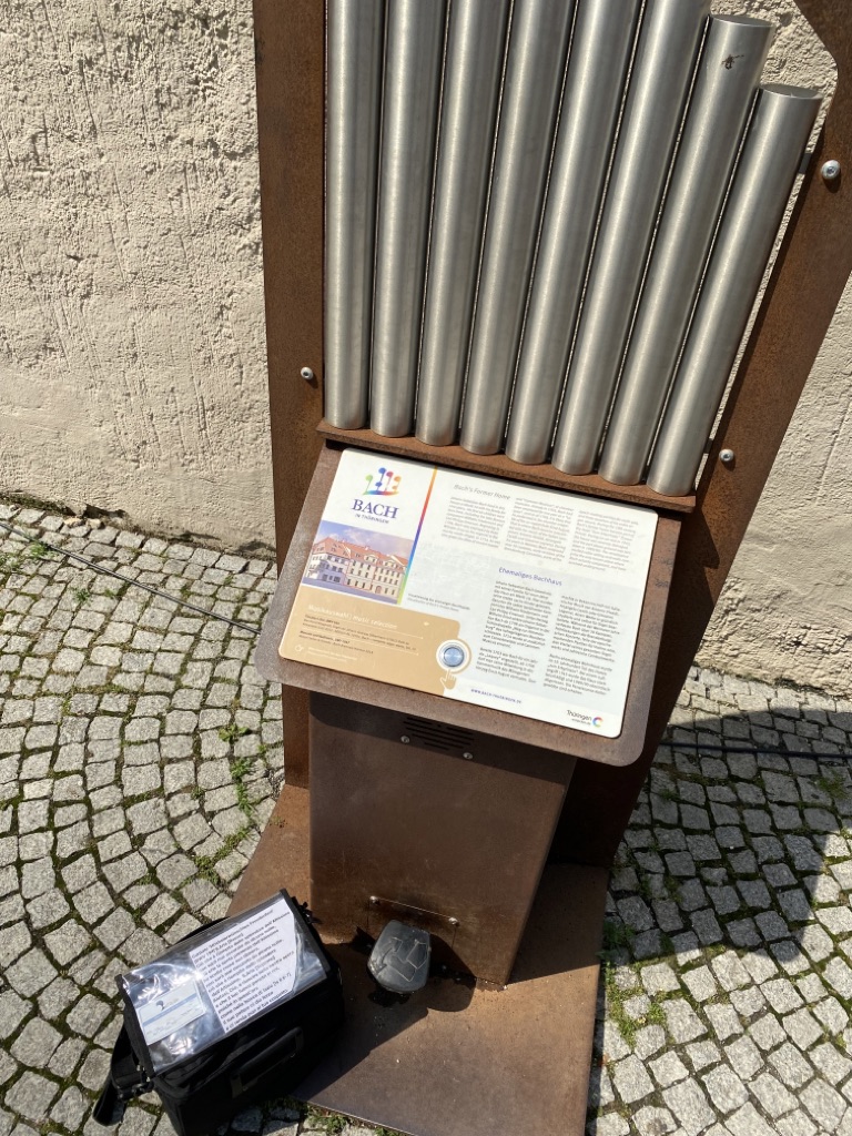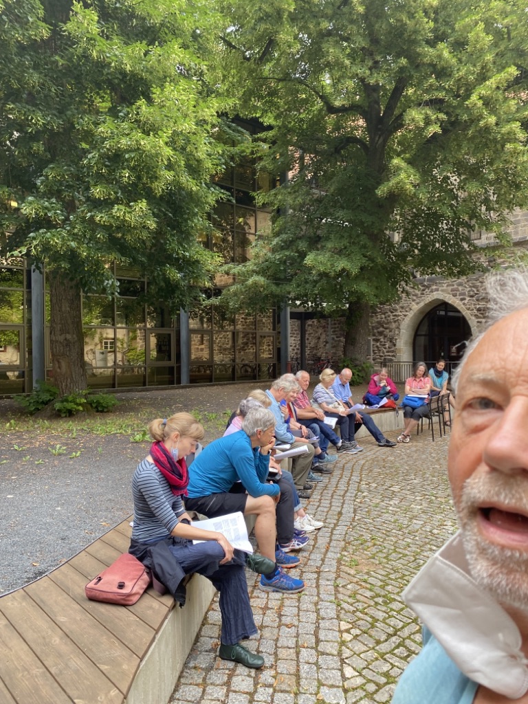 In Eisenach ging der junge Bach zur Latein-Schule, heute noch Gymnasium. Hier hörten wir im stimmungsvollen Innenhof vom Onkel des kleinen Sebastian seine nach Texten aus dem Hohelied komponierte ‚harmlos amouröse’ Motette ‚Meine Freundin, du bist schön!’. Sie führte uns in die barocken Familientreffen des Bach-Clans ein. Denn, wie wir noch bei unserem Besuch in Arnstadt hören werden (7.7.), legten die ‘Bache’ großen Wert auf ihre jährlichen Familientreffen mit deftigem feiern.. Auch ein Blick in den an der Stadtmauer gelegenen alten Stadtfriedhof belegt, dass hier in mehreren Generation ‚Bache‘ als Mütter, Stadtpfeiffer und Cantoren begraben sind und im Leben miteinander versippt waren.
