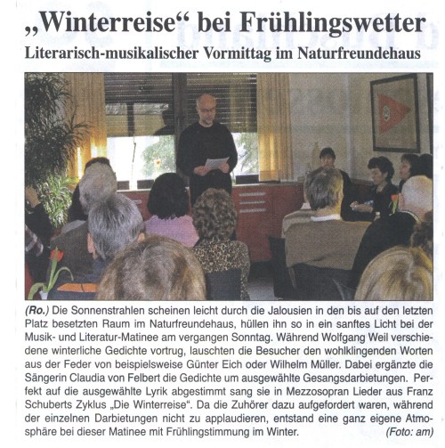Am Sonntag, 16. Januar 2011 um 11.00 Uhr findet im Naturfreundehaus Wuppertal Ronsdorf eine Wintermatinée mit Auszügen aus der „Winterreise“ von Franz Schubert statt. Umrahmt wird der musikalische Beitrag mit einer Einführung zu den Umbrüchen im 19. Jahrhundert in Bezug auf die Industrialisierung und einleitenden Worten zur Romantik, sowie den Künstlerbiographien von Franz Schubert und Wilhelm Müller. Die Texte werden im musikalisch-lyrischen Kontext erläutert.