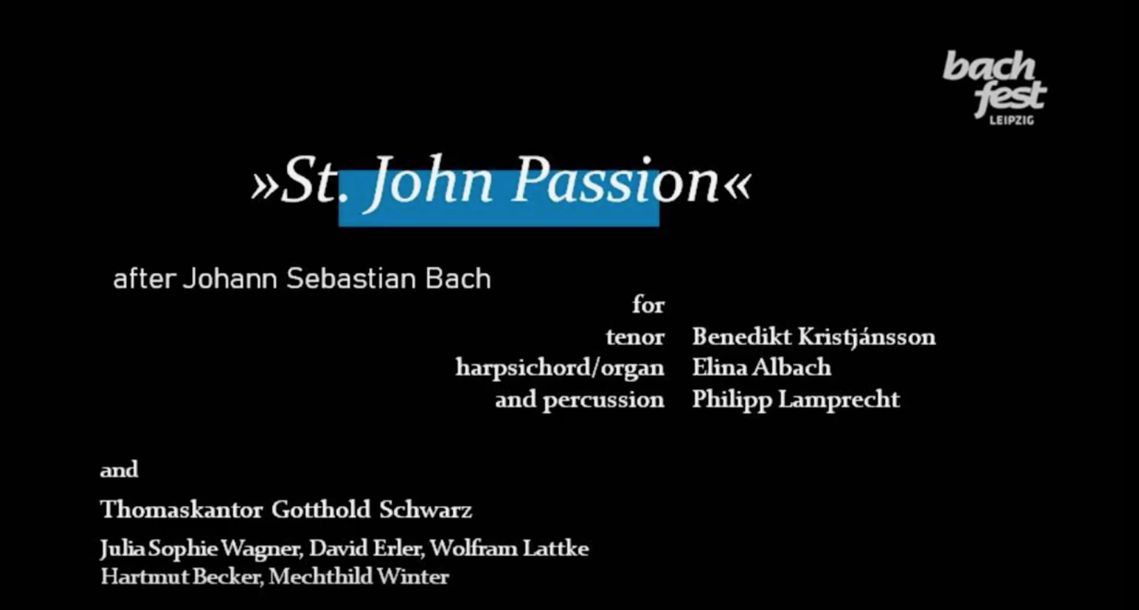Das Bachfest Leipzig versammelt die gesamte Musikwelt in Bachs Thomaskirche und ermöglicht ihr eine aktive Teilnahme an diesem einzigartigen Konzertprojekt. Zur Aufführung kommt eine Fassung, die bereits bei vergangenen Aufführungen Publikum wie Presse faszinierte und begeisterte. Der Tenor Benedikt Kristjánsson erzählt im intimen Rahmen die komplette Passion und nimmt verschiedene Rollen ein. Die Cembalistin Elina Albach und der Percussionist Philipp Lamprecht zeichnen das Orchester nach.