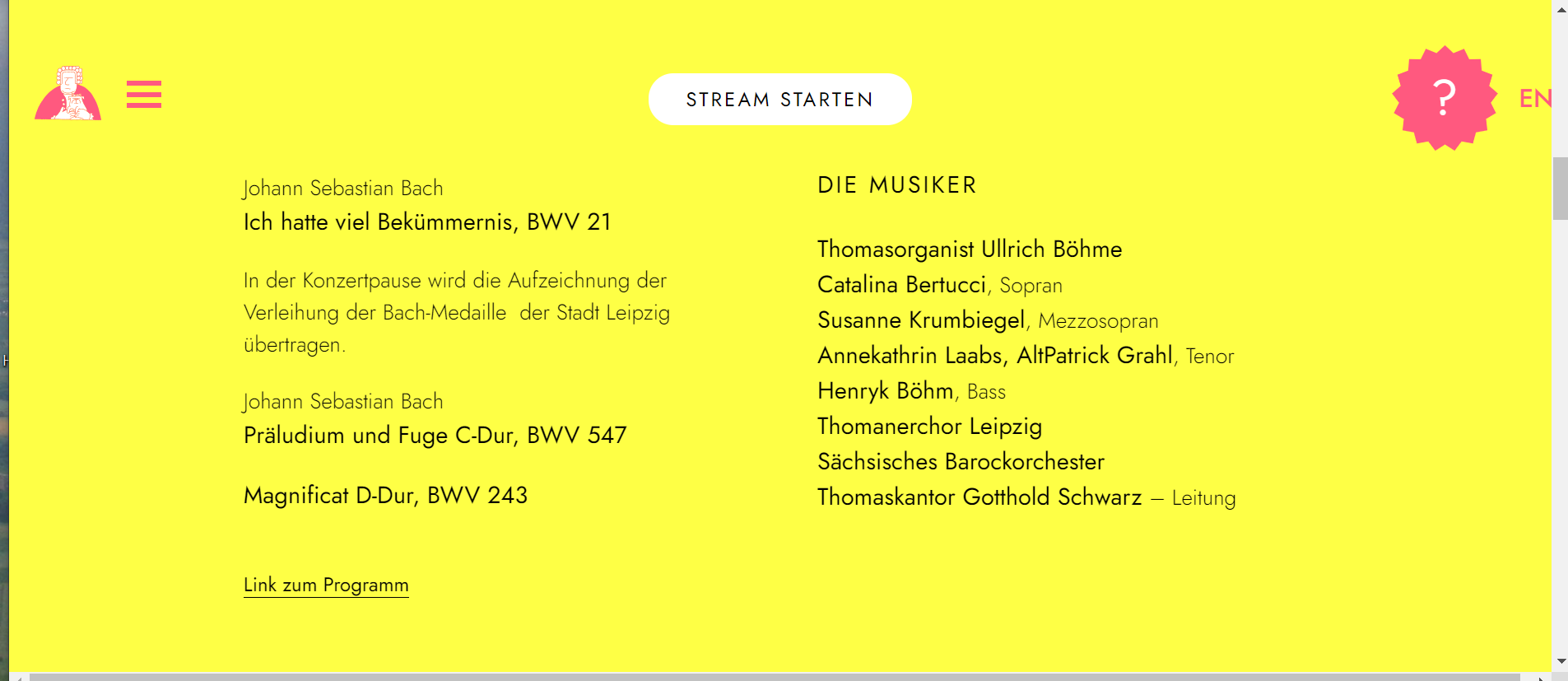 Die Zuschauer sind herzlich eingeladen, die Choräle – von der originalen Aufführungspraxis inspiriert – zu Hause mitzusingen.Dabei werden – neben Kristjánsson, den Instrumentalisten sowie fünf Sängern in der Thomaskirche um Thomaskantor Gotthold Schwarz – Künstler*innen und Bach-Chöre, die zum Bachfest 2020 eingeladen sind, zugeschaltet.