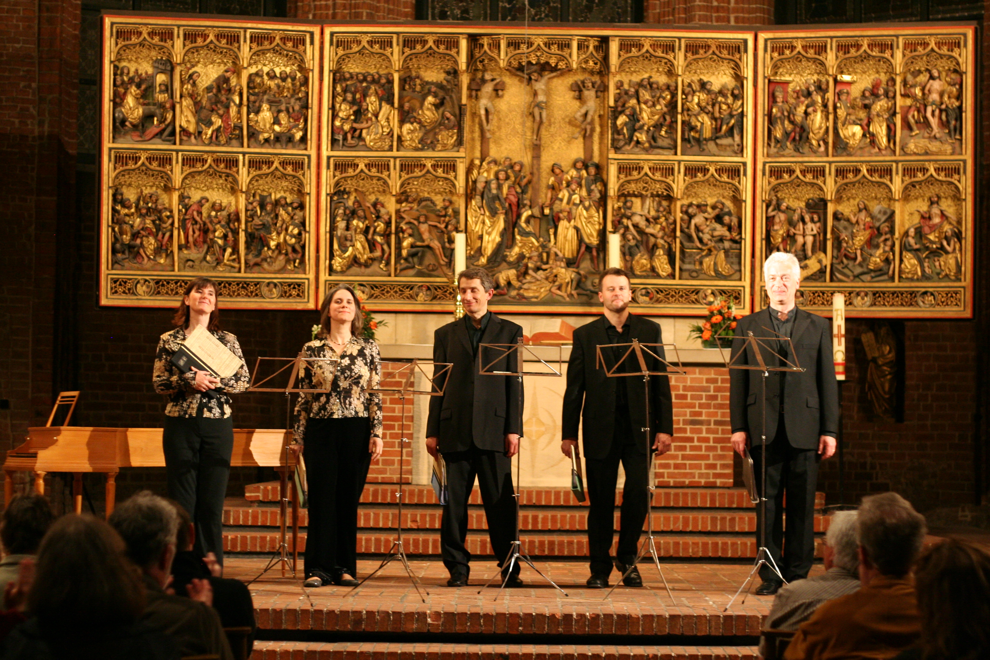 Aufgrund ihrer Erkrankung konnte die Altistin Julia Harberg (als Maria) ihre Textpassagen nur sprechen und wurde auf der Orgelempore von einer Ersatz-Altistin gesanglich vertreten. Ebenso hatte der Tenor Markus  Gruber als Evangelist mit einer Erkältung zu kämpfen und sang seinen Part mustergültig bis zum Ende durch. Friederike Weritz (Sopran) als Engel war ein Genuss ihr zuzuhören die stimmlichen Qualitäten sind bewundernswert.