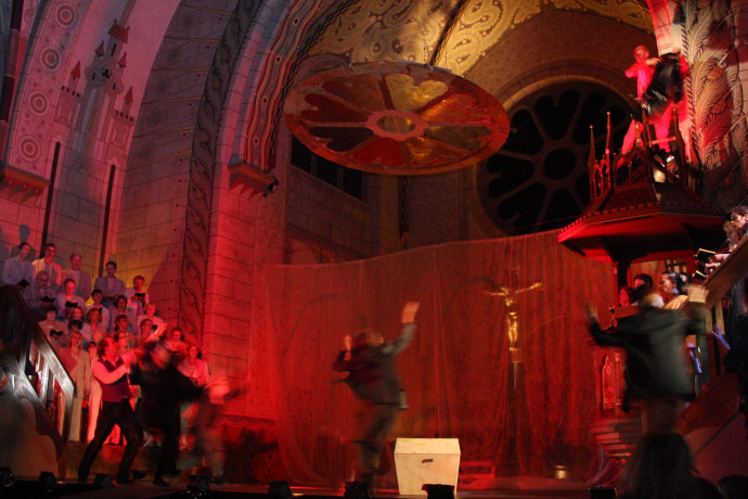Im Schlussritornell gab es eine sehr bewegende Szene wo die  Verbindung von der Bühne (Kronleuchter „Das himmlische Jerusalem“) mit einem Seidentuch bis hin zum Kreuz im Altarraum gezogen wurde. Das war eine sehr gelungene Symbolik von der Geburt Jesu bis zu seinem Tode am Kreuz, die eine überzeugende Aussagekraft besitzt und den Besucher zutiefst berührte.