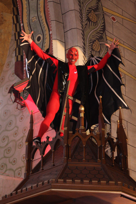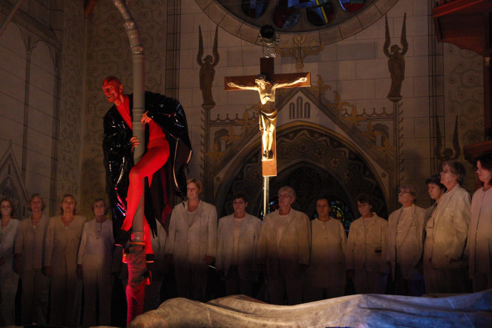 Schon beim Betreten des Kirchenraumes waren in der Dunkelheit grimmig aussehende Mitwirkende auf der Bühne, die in der Mitte des Kirchenschiffes aufgebaut war, zu erkennen, die den angekündigten „Prototyp des allgegenwärtige Bösen“ erahnen ließen.