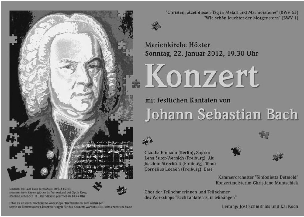 Johann Sebastian Bach (1685–1750): Kantate „Wer weiß, wie nahe mir mein Ende“, BWV 27 (Dominica 16 post Trinitatis) für Soli, Chor und Orchester – Corinna Kuhnen (Sopran), Julia Maria Spies (Alt), Volker Hanisch (Tenor), Fabian Kuhnen (Bass) / Johann Sebastian Bach: Kantate „Ich habe genung“, BWV 82 (Festo Purificationes Mariae) für Bass, Oboe, Streicher und Continuo – Solist: Konstantin Ingenpass (Bass)