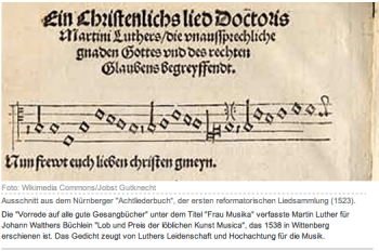 Ausschnitt aus dem Nürnberger "Achtliederbuch“, der ersten reformatorischen Liedsammlung (1523).Die "Vorrede auf alle gute Gesangbücher" unter dem Titel "Frau Musika" verfasste Martin Luther für Johann Walthers Büchlein "Lob und Preis der löblichen Kunst Musica", das 1538 in Wittenberg erschienen ist. Das Gedicht zeugt von Luthers Leidenschaft und Hochachtung für die Musik.