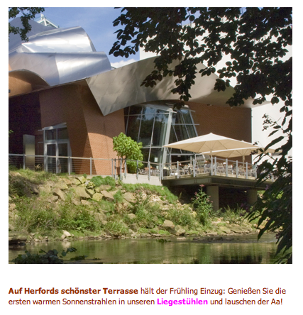 Auf der gemütlichen Terrasse des MARTa-Café am Flüsschen Aa gelegen, gab es den ersehnten Cappuccino sonstige Erfrischungen und ungewöhnliche Rohkost – ganz nach der Art des Museums – zu genießen, wie Äpfel oder Möhren, wo wird so etwas schon geboten, MARTa macht es möglich.