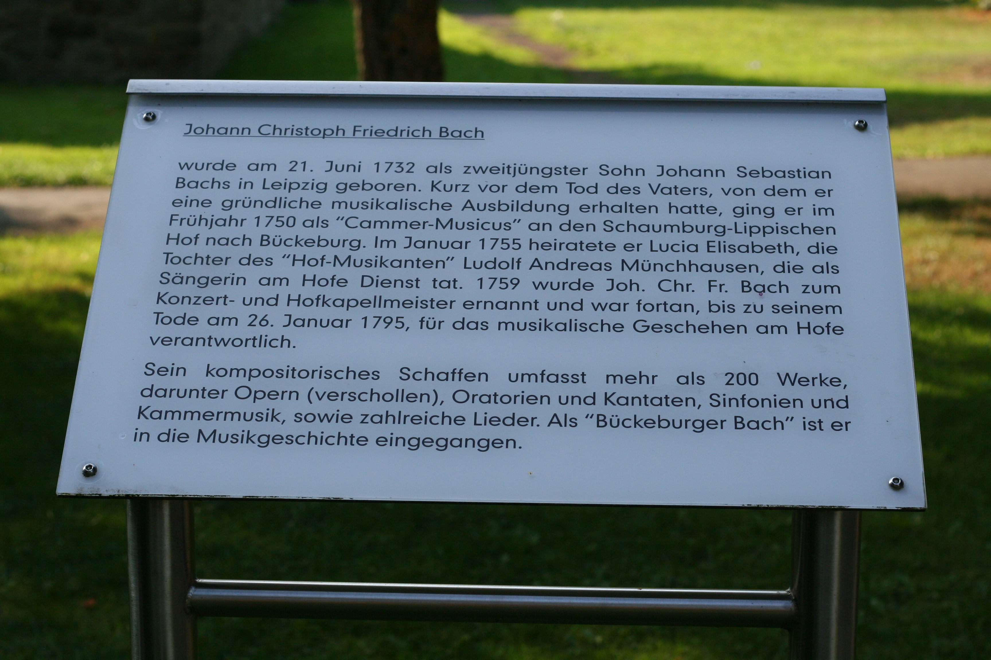 aus meiner Reihe: „Auf den Spuren von Johann Sebastian Bach“ möchte ich die Sichtweite ergänzen auf seinen zweitjüngsten Sohn „Johann Christoph Friedrich Bach“ ( genannt der „Bückeburger Bach“) – geboren am 21. Juni 1732 in Leipzig, gestorben am: 26. Januar 1795 im Fürstentum Schaumburg-Lippe in „Bückeburg“ – Niedersachsen.