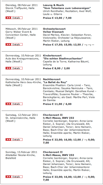 Wieder ein Festschmaus in OWL (Ostwestfalen-Lippe) hier finden vom 04.02.2011 bis zum 13.2.2011 die 84. Haller Bach-Tage statt. Das gesamte Veranstaltungs-Programm für 2011 füge ich bei. Es sind hochkarätige Veranstaltungen dabei, u.a. findet in der Altstädter Nicolai-Kirche in Bielefeld die Schlussveranstaltung mit der